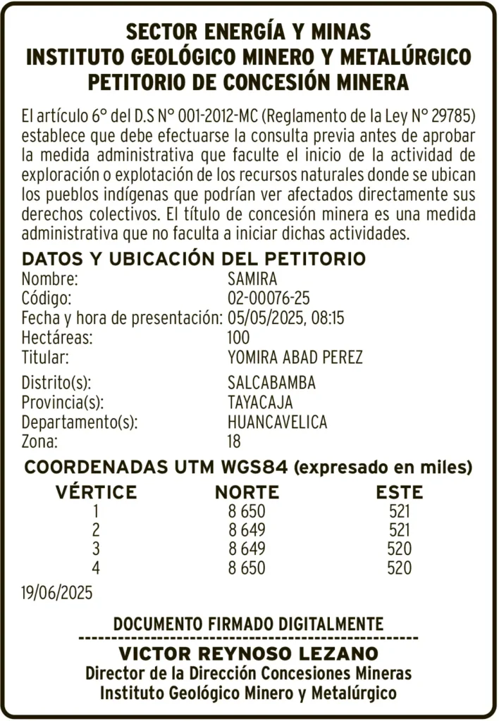 PETITORIOS MINEROS - HUANCAVELICA PETITORIO MINERO HUANCAVELICA – VIERNES 04/JUL/2025 4 de julio de 2025 DATOS Y UBICACION DEL PETITORIONombre: SAMIRACódigo: 02-00076-25Post navigationAnterior EDICTO MATRIMONIAL – VIERNES 04/JUL/2025Próximo IPD JUNÍN EMITE COMUNICADO RESPECTO AL ESTADIO HUANCAYO