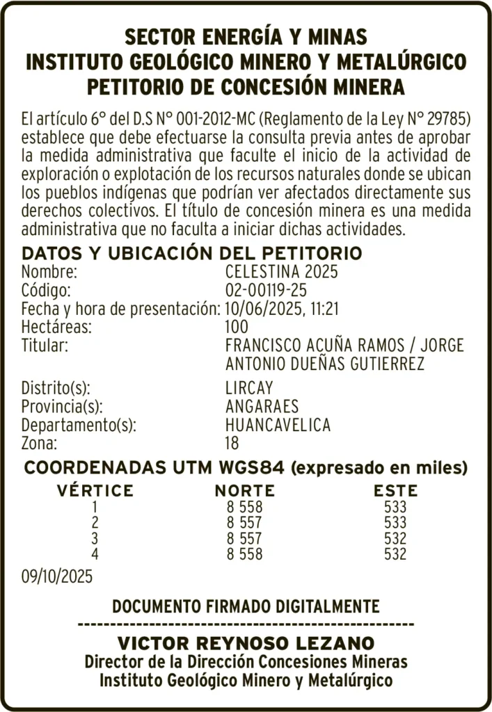 PETITORIOS MINEROS - HUANCAVELICA PETITORIO MINERO HUANCAVELICA – VIERNES 05/DIC/2025 viernes, 5 de diciembre de 2025 | 1:22 AM DATOS Y UBICACION DEL PETITORIONombre: CELESTINA 2025Código: 02-00119-25DATOS Y UBICACION DEL PETITORIONombre: SACSAMARCA IICódigo: 59-00056-25Post navigationAnterior RECTIFICACIÓN DE PARTIDA – VIERNES 05/DIC/2025Próximo PETITORIO MINERO PASCO – VIERNES 05/DIC/2025