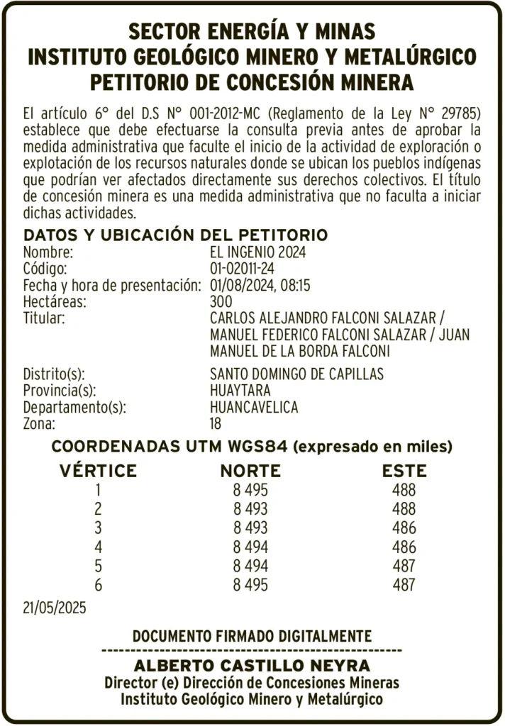 PETITORIOS MINEROS - HUANCAVELICA PETITORIO MINERO HUANCAVELICA – VIERNES 11/JUL/2025 viernes, 11 de julio de 2025 | 1:15 AM DATOS Y UBICACION DEL PETITORIONombre: EL INGENIO 2024Código: 01-02011-24Post navigationAnterior CONVOCATORIAS – VIERNES 11/JUL/2025Próximo PETITORIO MINERO PASCO – VIERNES 11/JUL/2025