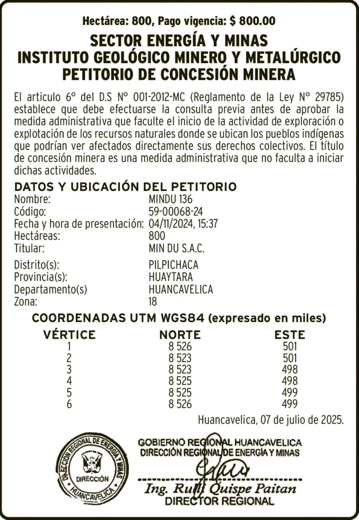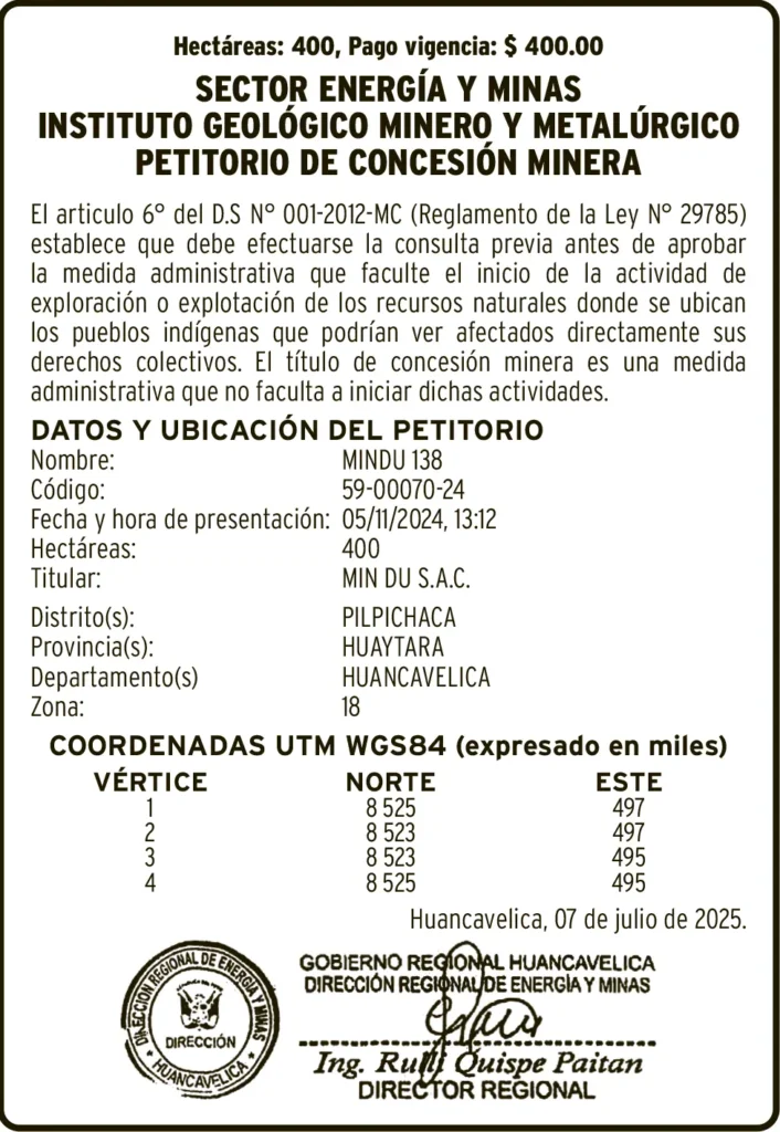 PETITORIOS MINEROS - HUANCAVELICA PETITORIO MINERO HUANCAVELICA – VIERNES 22/AGO/2025 22 de agosto de 2025 DATOS Y UBICACION DEL PETITORIONombre: MINDU 136Código: 59-00068-24DATOS Y UBICACION DEL PETITORIONombre: MINDU 138Código: 59-00070-24Post navigationAnterior LAMENTABLE: “HERACLIO TAPIA” EN PÉSIMAS CONDICIONESPróximo NOTIFICACIÓN DE PRETENSIÓN – VIERNES 22/AGO/2025