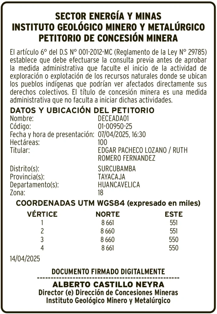 PETITORIOS MINEROS - HUANCAVELICA PETITORIO MINERO HUANCAVELICA – VIERNES 23/MAY/2025 23 de mayo de 2025 DATOS Y UBICACION DEL PETITORIONombre: DECEADA01Código: 01-00950-25Post navigationAnterior CONVOCATORIAS – VIERNES 23/MAY/2025Próximo COMUNICADO – VIERNES 23/MAY/2025