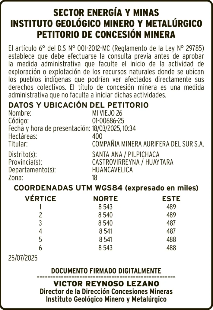 PETITORIOS MINEROS - HUANCAVELICA PETITORIO MINERO HUANCAVELICA – VIERNES 29/AGO/2025 viernes, 29 de agosto de 2025 | 1:23 AM DATOS Y UBICACION DEL PETITORIONombre: MI VIEJO 26Código: 01-00686-25Post navigationAnterior EDICTO JUDICIAL HUANCAVELICA – VIERNES 29/AGO/2025Próximo SANEAMIENTO FÍSICO LEGAL – VIERNES 29/AGO/2025