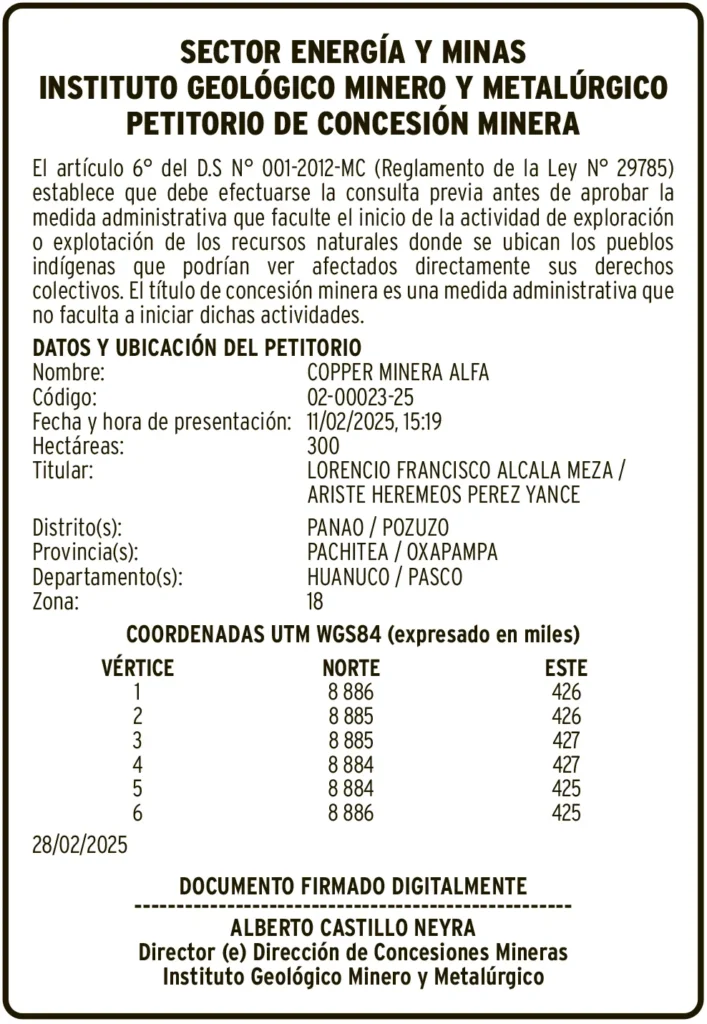 PETITORIOS MINEROS - PASCO PETITORIO MINERO PASCO – LUNES 05/MAY/2025 5 de mayo de 2025 DATOS Y UBICACION DEL PETITORIONombre: COPPER MINERA ALFACódigo: 02-00023-25Post navigationAnterior PETITORIO MINERO HUANCAVELICA – LUNES 05/MAY/2025Próximo HERIDAS ESPOSA E HIJAS: IMPRUDENTE CHOCA Y MATA A PADRE DE FAMILIA