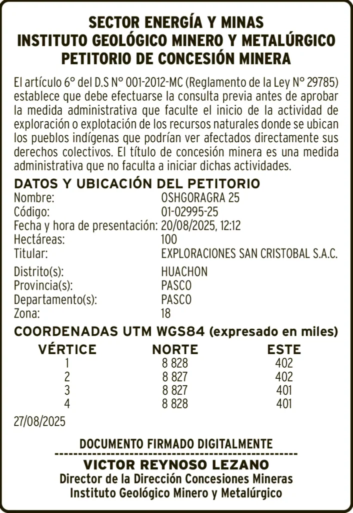 PETITORIOS MINEROS - PASCO PETITORIO MINERO PASCO – LUNES 08/SET/2025 1 min read 8 de septiembre de 2025 DATOS Y UBICACION DEL PETITORIONombre: OSHGORAGRA 25Código: 01-02995-25Continue ReadingPrevious VENTA DE INMUEBLES – LUNES 08/SET/2025Next EDICTO JUDICIAL HUANCAVELICA – LUNES 08/SET/2025