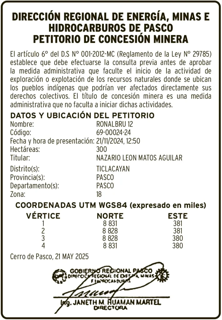 PETITORIOS MINEROS - PASCO PETITORIO MINERO PASCO – LUNES 16/JUN/2025 16 de junio de 2025 DATOS Y UBICACION DEL PETITORIONombre: RONALBRU 12Código: 69-00024-24Post navigationAnterior SANEAMIENTO FÍSICO LEGAL – LUNES 16/JUN/2025Próximo EDICTO JUDICIAL HUANCAVELICA – LUNES 16/JUN/2025