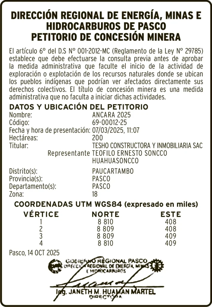 PETITORIOS MINEROS - PASCO PETITORIO MINERO PASCO – LUNES 26/ENE/2026 lunes, 26 de enero de 2026 | 6:47 AM DATOS Y UBICACION DEL PETITORIONombre: ANCARA 2025Código: 69-00012-25Post navigationAnterior PETITORIO MINERO HUANCAVELICA – LUNES 26/ENE/2026Próximo POR LXX 70 ANIVERSARIO DEL DISTRITO: JANET LUZ PÉREZ MARTEL ELEGIDA COMO MISS KICHKI
