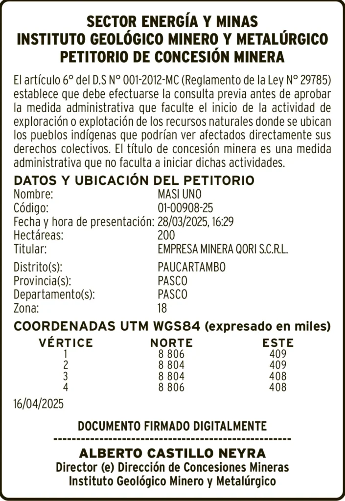 PETITORIOS MINEROS - PASCO PETITORIO MINERO PASCO – MARTES 07/OCT/2025 7 de octubre de 2025 DATOS Y UBICACION DEL PETITORIONombre: MASI UNOCódigo: 01-00908-25Post navigationAnterior NOTIFICACIÓN DE PRETENSIÓN – MARTES 07/OCT/2025Próximo PETITORIO MINERO HUANCAVELICA – MARTES 07/OCT/2025