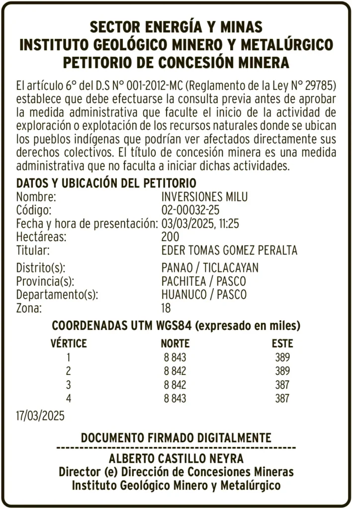 PETITORIOS MINEROS - PASCO PETITORIO MINERO PASCO – MARTES 15/ABR/2025 15 de abril de 2025 DATOS Y UBICACION DEL PETITORIONombre: INVERSIONES MILUCódigo: 02-00032-25Post navigationAnterior PETITORIO MINERO HUANCAVELICA – MARTES 15/ABR/2025Próximo COMUNICADO – MARTES 15/ABR/2025