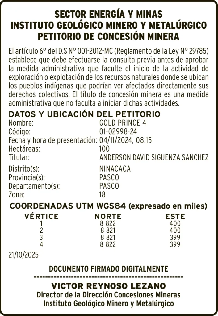 PETITORIOS MINEROS - PASCO PETITORIO MINERO PASCO – MIÉRCOLES 26/NOV/2025 26 de noviembre de 2025 DATOS Y UBICACION DEL PETITORIONombre: GOLD PRINCE 4Código: 01-02998-24Post navigationAnterior NOTIFICACIÓN DE PRETENSIÓN – MIÉRCOLES 26/NOV/2025Próximo PUBLICACIÓN JEE HUANCAVELICA – MIÉRCOLES 26/NOV/2025