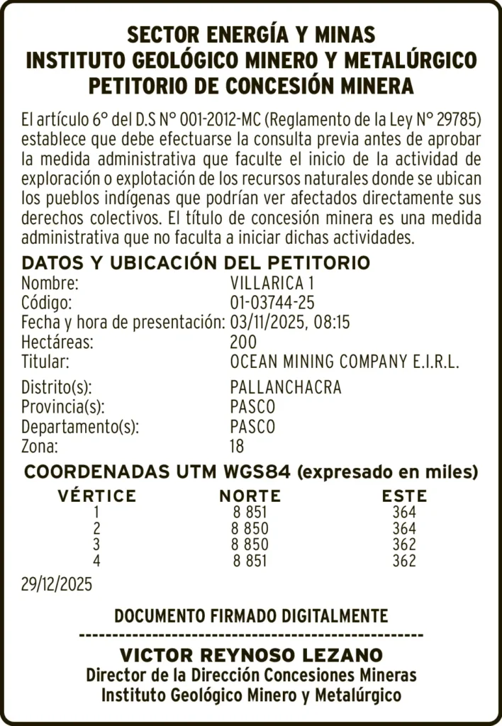 PETITORIOS MINEROS - PASCO PETITORIO MINERO PASCO – VIERNES 09/ENE/2026 viernes, 9 de enero de 2026 | 6:57 AM DATOS Y UBICACION DEL PETITORIONombre: KILMARCódigo: 01-01292-24DATOS Y UBICACION DEL PETITORIONombre: VILLARICA 1Código: 01-03744-25Post navigationAnterior EXPECTATIVA POR SORTEO: HOY SE CONOCERÁ FIXTURE DEL CAMPEONATO 2026Próximo CON VARIAS NOVEDADES: SPORT HUANCAYO SE “ARMA” PARA LA PRESENTE TEMPORADA