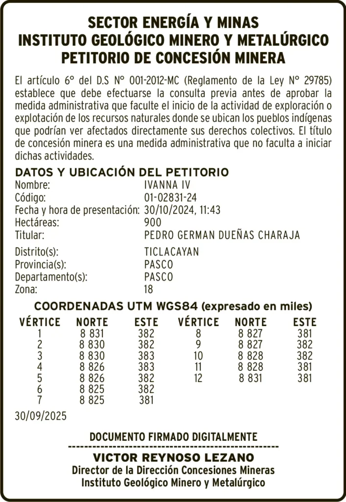 PETITORIOS MINEROS - PASCO PETITORIO MINERO PASCO – VIERNES 10/OCT/2025 10 de octubre de 2025 DATOS Y UBICACION DEL PETITORIONombre: IVANNA IVCódigo: 01-02831-24Post navigationAnterior NOTIFICACIÓN DE PRETENSIÓN – VIERNES 10/OCT/2025Próximo EDICTO JUDICIAL HUANCAVELICA – VIERNES 10/OCT/2025