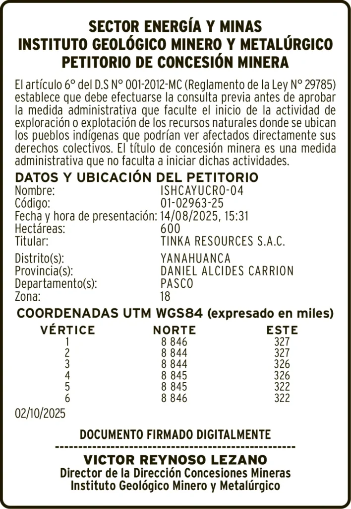 PETITORIOS MINEROS - PASCO PETITORIO MINERO PASCO – VIERNES 31/OCT/2025 1 min read 31 de octubre de 2025 DATOS Y UBICACION DEL PETITORIONombre: ISHCAYUCRO-04Código: 01-02963-25Continue ReadingPrevious NOTIFICACIÓN DE PRETENSIÓN – VIERNES 31/OCT/2025Next JEFE NACIONAL DE LA ONPE ASEGURA ELECCIONES CON TODA GARANTÍA