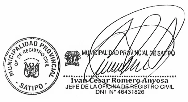 Ante la Oficina de Registro del Estado Civil afiliada a la Municipalidad Provincial de Satipo, se viene tramitando el expediente administrativo N°42968, de fecha 18 de diciembre del 2025, por la cual, se solicita la Rectificación Administrativa del Acta de Nacimiento N°818, Libro N°107 del año 1989 incorporada por el RENIEC con el Acta N°1020548915 correspondiente de JHAMENI CINDY VALDEZ HILARIO, por existir ERROR/OMISIÓN en el cuerpo principal del acta, en el rubro de los Prenombres del Padre, dice: DAVID VALDEZ NUÑEZ, debiendo ser lo correcto: JUAN DAVID VALDEZ NUÑEZ. Lo que comunico para los fines de ley, en virtud al art. 71 del Decreto Supremo N° 015-98-PСМ.