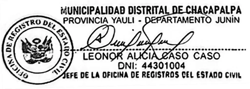 Ante la Oficina de Registro de Estado Civil que funciona en la Municipalidad Distrital de Chacapalpa, Provincia de Yauli, Departamento de Junín, se ha presentado el/la ciudadano (a) MERCEDES ROSARIO ARTICA VELOZ, identificado (a) con DNI. N°09337045, generándose el Expediente N°030-2026 de fecha 13 de abril del 2026, hija del titular quien solicita la Rectificación Administrativa del Acta de Matrimonio N°001 inscrita el día 05 de enero 1957, perteneciente a JORGE ÁRTICA ALVAREZ CALDERON  y HILDA VELOZ FARGE, en el cuerpo de dicha acta se ha evidenciado que se ha consignado OMISION el apellido materno del CONTRAYENTE titular (dato a rectificar) donde figura: JORGE ARTICA debiendo ser lo correcto: «JORGE ARTICA ALVAREZ CALDERON» Conforme al acta de nacimiento del titular contrayente, expedido por la Municipalidad Distrital de Chacapalpa, Provincia de Yauli, Departamento de Junin, su petición ampara a lo dispuesto en la Directiva DI-008-DRC/001 «Procedimientos del Registro Civil». Las personas que se consideran afectadas por la presente rectificación Administrativa, podrán presentar su oposición dentro del plazo de (15) días hábiles siguientes a la fecha de la presente publicación. Se efectúa la presente publicación de conformidad con el artículo 73° del D.S. 015-98-PCM.