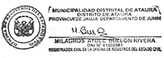 Ante la oficina de Registro del estado Civil de la Municipalidad Distrital de Ataura se presentó la ciudadana, MARIA VICTORIA ROMERO RAMIREZ, identificado con DNI N° 19858051, generándose el expediente N°0655-2026 del día 30 de marzo del 2026 solicitando la rectificación administrativa del acta de matrimonio de sus padres, acta N°65 de fecha 15 de julio de 1950, en el sentido que por error en los datos del cónyuge se omitió el apellido materno que es «HILARIO» y en los datos de la cónyuge se consignó erróneamente el nombre que es «ZENOBIA»; debiendo figurar los datos del cónyuge como «GUILLERMO PROSPERO ROMERO HILARIO» y de la cónyuge como «ZENOBIA RAMIREZ NAUPARI» y no como erróneamente se encuentran consignados.