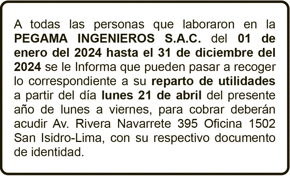 REPARTO DE UTILIDADES REPARTO DE UTILIDADES – MIÉRCOLES 16/ABR/2025 miércoles, 16 de abril de 2025 | 1:22 AM REPARTO DE UTILIDADESPEGAMA INGENIEROS S.A.C.Post navigationAnterior PETITORIO MINERO PASCO – MIÉRCOLES 16/ABR/2025Próximo RECTIFICACIÓN DE PARTIDA – MIÉRCOLES 16/ABR/2025