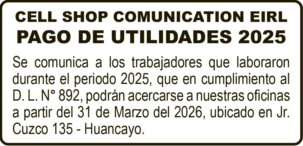 REPARTO DE UTILIDADES REPARTO DE UTILIDADES – SÁBADO 21/MAR/2026 sábado, 21 de marzo de 2026 | 10:42 AM CELL SHOP COMUNICATION EIRLPAGO DE UTILIDADES 2025Navegación de entradasAnterior PETITORIO MINERO HUANCAVELICA – SÁBADO 21/MAR/2026