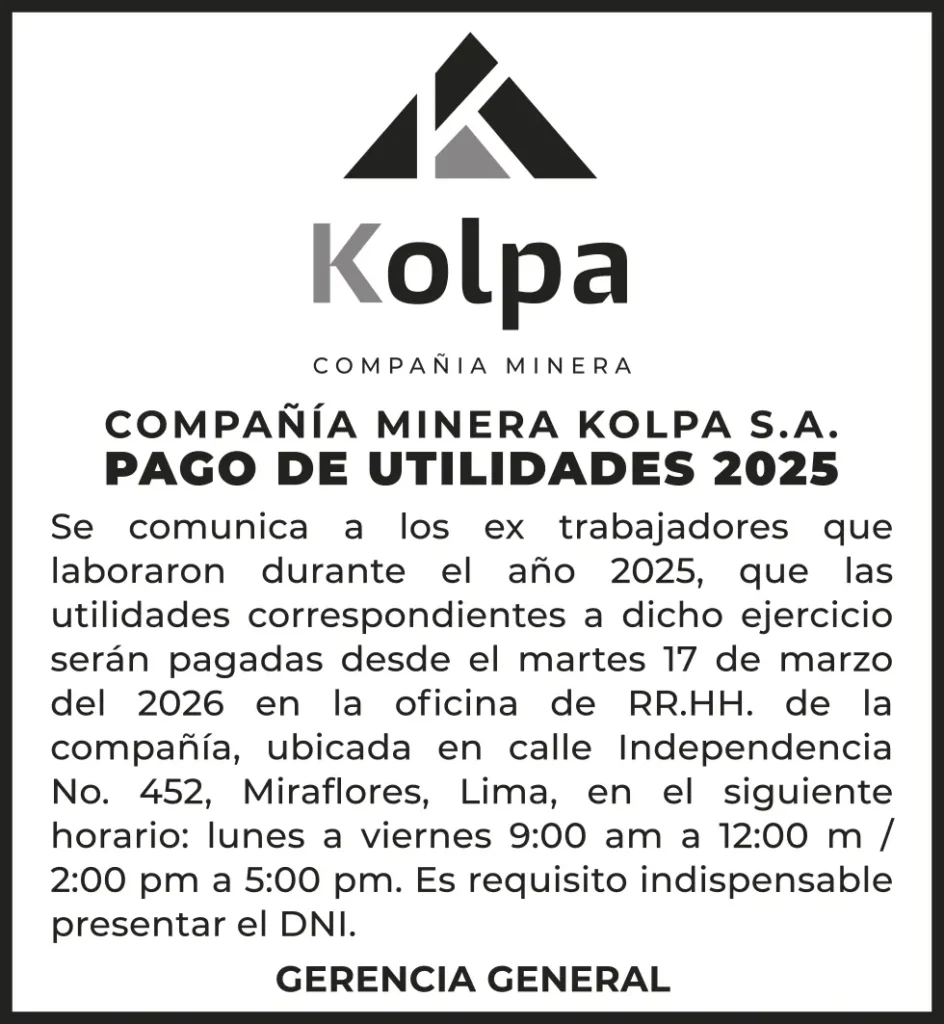 HUANCAVELICA REPARTO DE UTILIDADES REPARTO DE UTILIDADES – VIERNES 13/MAR/2026 viernes, 13 de marzo de 2026 | 6:03 AM COMPAÑIA MINERA KOLPA S.A.PAGO DE UTILIDADES 2025Navegación de entradasAnterior PAUCARÁ: ALUMNOS LLEVAN 15 AÑOS EN AULAS PREFABRICADASSiguiente EDICTO JUDICIAL HUANCAVELICA – VIERNES 13/MAR/2026