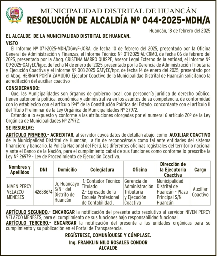 RESOLUCIÓN / ACUERDO / DECRETO MUNICIPAL RESOLUCIÓN DE ALCALDÍA – JUEVES 13/MAR/2025 jueves, 13 de marzo de 2025 | 1:05 AM MUNICIPALIDAD DISTRITAL DE HUANCANRESOLUCION DE ALCALDÍA Nº 044-2025-MDH/APost navigationAnterior EDICTO MATRIMONIAL – JUEVES 13/MAR/2025Próximo NOTIFICACIÓN DE PRETENSIÓN – JUEVES 13/MAR/2025