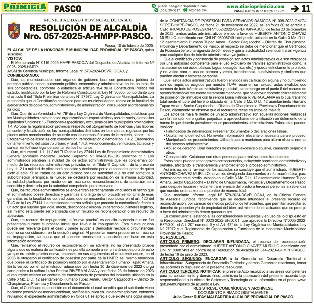RESOLUCIÓN / ACUERDO / DECRETO MUNICIPAL RESOLUCIÓN DE ALCALDÍA – MARTES 18/MAR/2025 18 de marzo de 2025 MUNICIPALIDAD PROVINCIAL DE PASCORESOLUCION DE ALCALDÍA Nro 057-2025-A-HMPP-PASCOPost navigationAnterior ORDENANZA MUNICIPAL – MARTES 18/MAR/2025Próximo RECTIFICACIÓN DE PARTIDA – MARTES 18/MAR/2025