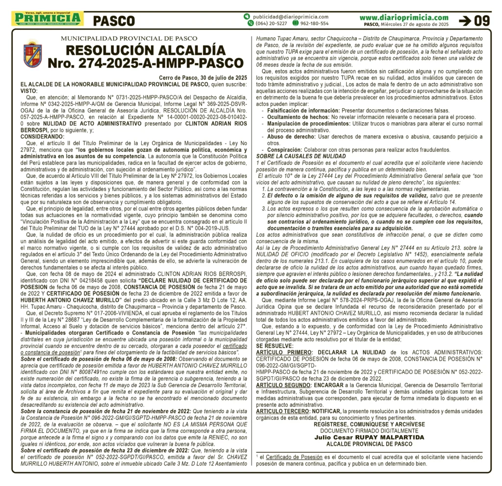 PASCO RESOLUCIÓN / ACUERDO / DECRETO MUNICIPAL RESOLUCIÓN DE ALCALDÍA – MIÉRCOLES 27/AGO/2025 27 de agosto de 2025 MUNICIPALIDAD PROVINCIAL DE PASCORESOLUCIÓN DE ALCALDÍA Nro. 274-2025-A-HMPP-PASCOPost navigationAnterior ORDENANZA MUNICIPAL – MIÉRCOLES 27/AGO/2025Próximo AUMENTAN LOS RECLAMOS: SUSPENSO PARA CONOCER A REPRESENTANTES DE JUNÍN