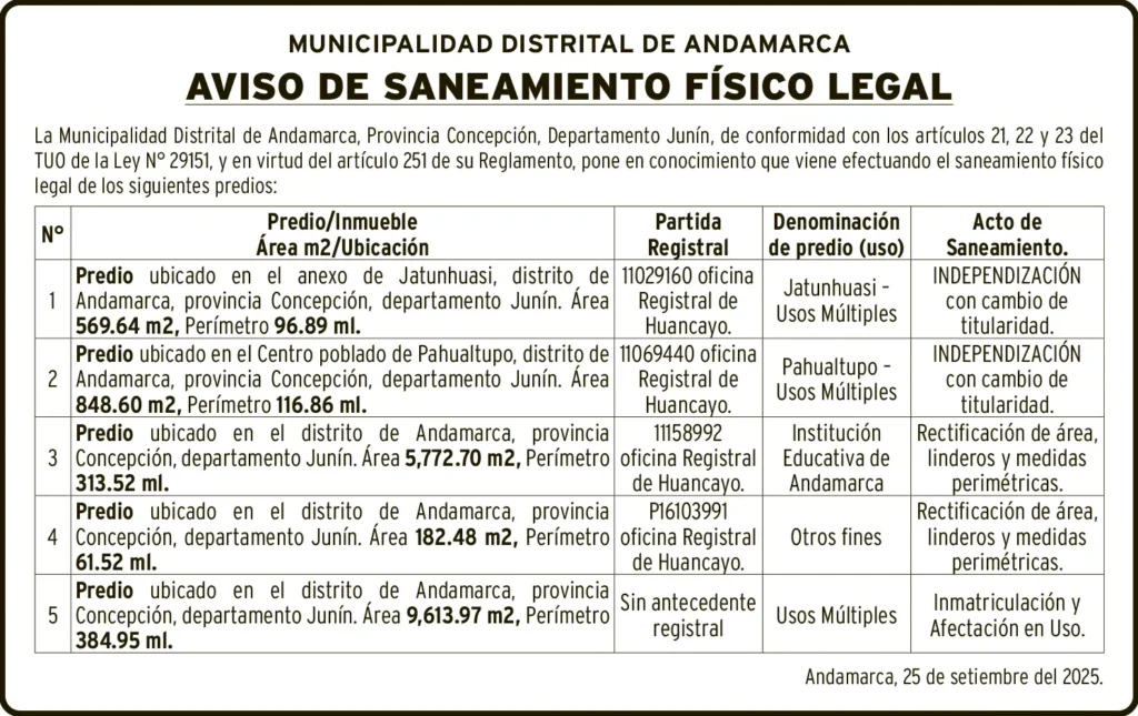 JUNIN SANEAMIENTO FÍSICO LEGAL SANEAMIENTO FÍSICO LEGAL – JUEVES 25/SET/2025 25 de septiembre de 2025 AVISO DE SANEAMIENTO FÍSICO LEGALMUNICIPALIDAD DISTRITAL DE ANDAMARCAPROVINCIA CONCEPCIÓN – DEPARTAMENTO JUNÍNPARTIDA REGISTRAL 11029160 / 11069440 / 11158992 / P16103991Post navigationAnterior PETITORIO MINERO PASCO – JUEVES 25/SET/2025Próximo RECTIFICACIÓN DE PARTIDA – JUEVES 25/SET/2025