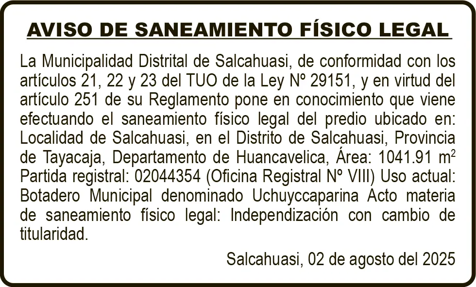SANEAMIENTO FÍSICO LEGAL SANEAMIENTO FÍSICO LEGAL – LUNES 04/AGO/2025 4 de agosto de 2025 SANEAMIENTO FÍSICO LEGALMUNICIPALIDAD DISTRITAL DE SALCAHUASIPROVINCIA DE TAYACAJA – DEPARTAMENTO DE HUANCAVELICAPARTIDA REGISTRAL: 02044354Post navigationAnterior PETITORIO MINERO HUANCAVELICA – LUNES 04/AGO/2025Próximo HUANCAÍNA ANITA POMA YA ENTRENA EN AREQUIPA
