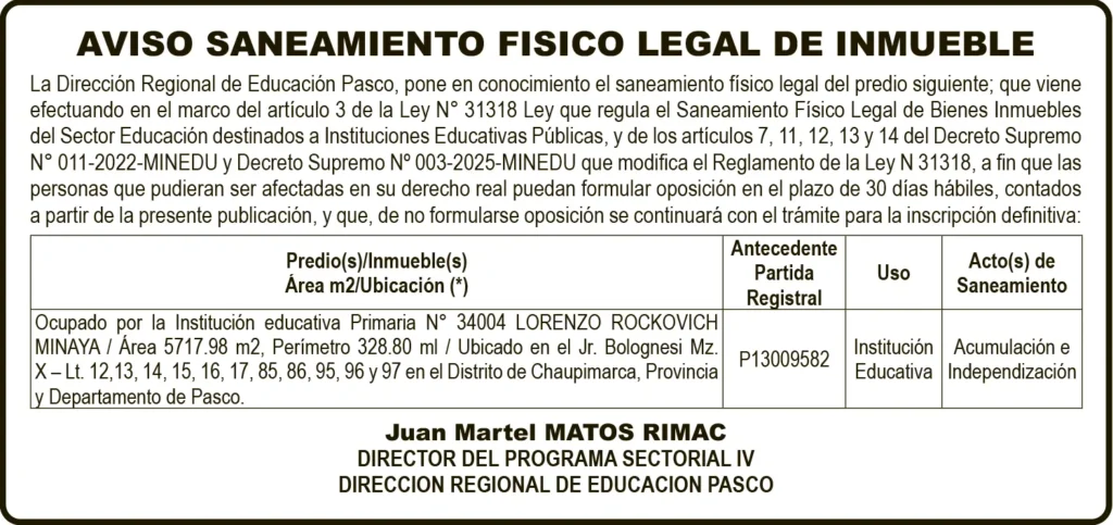 PASCO SANEAMIENTO FÍSICO LEGAL SANEAMIENTO FÍSICO LEGAL – MARTES 23/DIC/2025 23 de diciembre de 2025 AVISO SANEAMIENTO FÍSICO LEGAL DE INMUEBLEDIRECCIÓN REGIONAL DE EDUCACIÓN PASCOANTECEDENTE PARTIDA REGISTRAL P13009582Post navigationAnterior CASTROVIRREYNA: OCHO MUERTOS Y SIETE HERIDOSPróximo PLAN AMBIENTAL DETALLADO – PAD