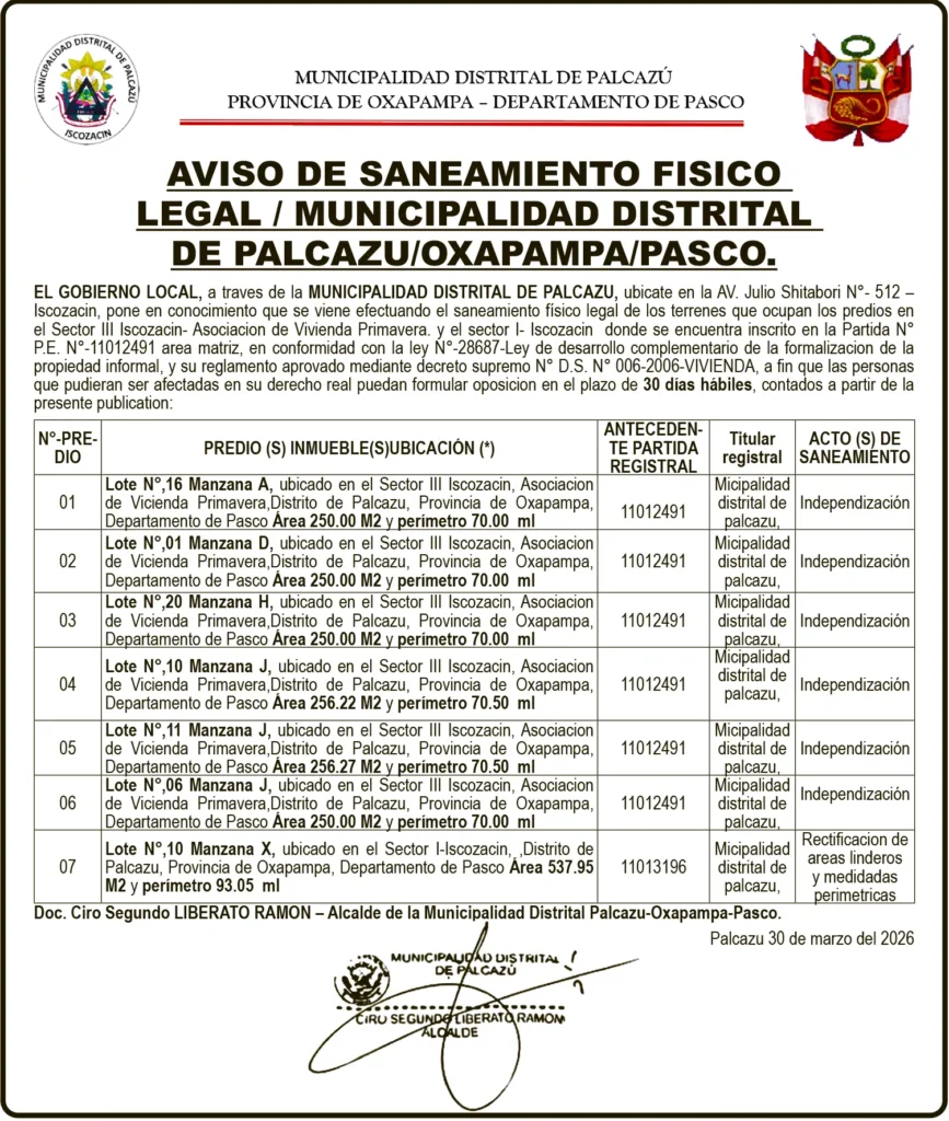 PASCO SANEAMIENTO FÍSICO LEGAL SANEAMIENTO FÍSICO LEGAL – MARTES 31/MAR/2026 martes, 31 de marzo de 2026 | 6:32 AM MUNICIPALIDAD DISTRITAL DE PALCAZUPROVINCIA DE OXAPAMPA – DEPARTAMENTO DE PASCOAVISO DE SANEAMIENTO FÍSICO LEGALANTECEDENTE PARTIDA REGISTRAL P.E. N° 11012491Navegación de entradasAnterior NOTIFICACIÓN DE PRETENSIÓN – MARTES 31/MAR/2026Siguiente PRIMERA Y SEGUNDA FISCALÍA EN OPERATIVO DE VERIFICACIÓN DE PRODUCTOS VENCIDOS