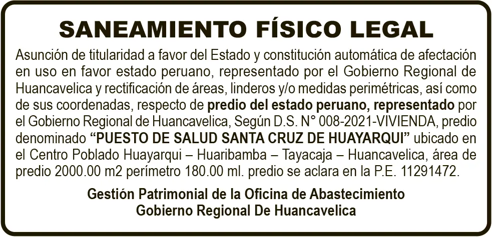 SANEAMIENTO FÍSICO LEGAL SANEAMIENTO FÍSICO LEGAL – SÁBADO 26/JUL/2025 sábado, 26 de julio de 2025 | 1:30 AM SANEAMIENTO FÍSICO LEGALGOBIERNO REGIONAL DE HUANCAVELICAP.E. 11291472Post navigationAnterior TRAGEDIA EN ANTA: CAÍDA DE VEHÍCULO DEJA 2 MUERTOS Y DOS HERIDOSPróximo EDICTO MATRIMONIAL – SÁBADO 26/JUL/2025