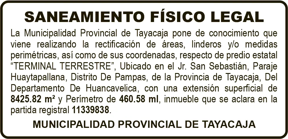 HUANCAVELICA SANEAMIENTO FÍSICO LEGAL SANEAMIENTO FÍSICO LEGAL – SÁBADO 29/NOV/2025 29 de noviembre de 2025 SANEAMIENTO FÍSICO LEGALMUNICIPALIDAD PROVINCIAL DE TAYACAJAPARTIDA REGISTRAL: 11339838Post navigationAnterior CONVOCATORIAS – SÁBADO 29/NOV/2025Próximo ASCENSO FUTBOLÍSTICO: LORETO Y ANDAHUAYLAS A LA LIGA PROFESIONAL FEMENINA