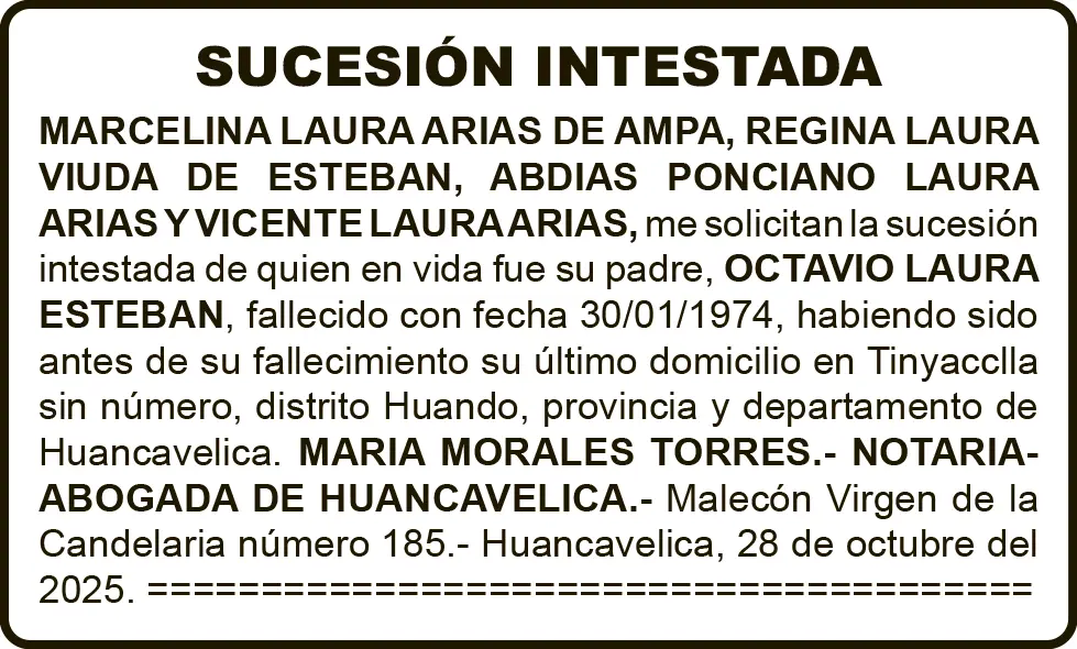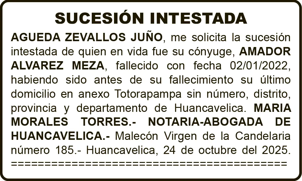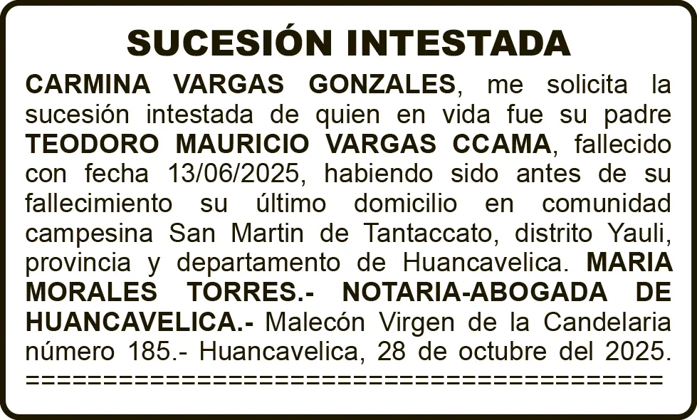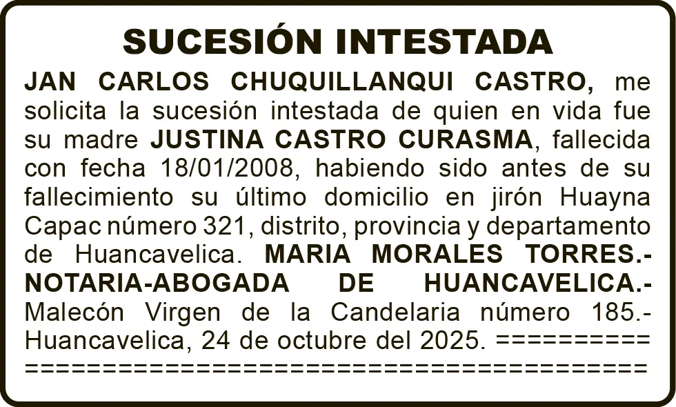 HUANCAVELICA SUCESIÓN INTESTADA SUCESIÓN INTESTADA – JUEVES 30/OCT/2025 1 min read 30 de octubre de 2025 SUCESIÓN INTESTADAMARIA MORALES TORRESNOTARIA – ABOGADA DE HUANCAVELICAContinue ReadingPrevious PETITORIO MINERO PASCO – JUEVES 30/OCT/2025Next EDICTO JUDICIAL HUANCAVELICA – JUEVES 30/OCT/2025