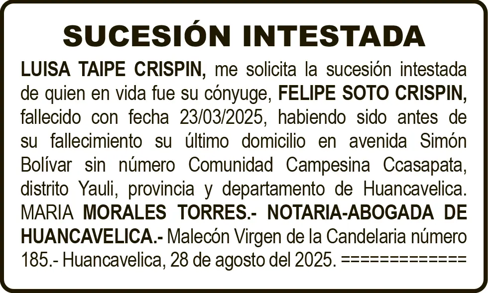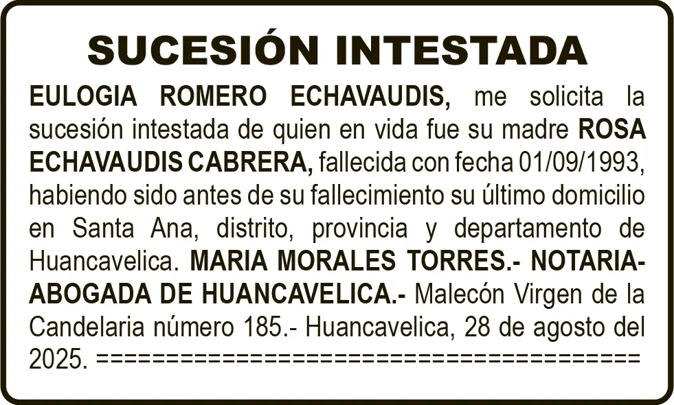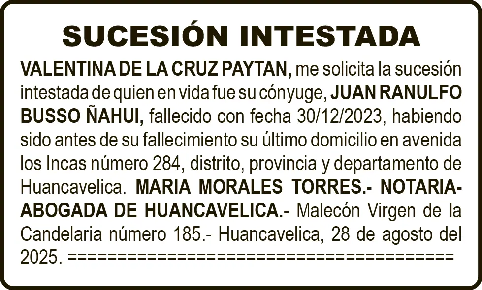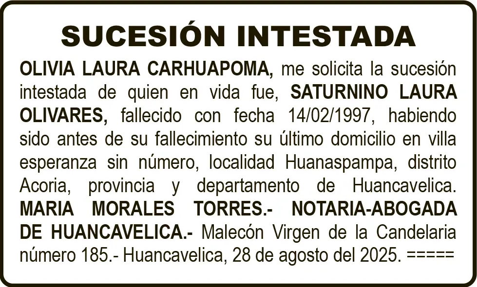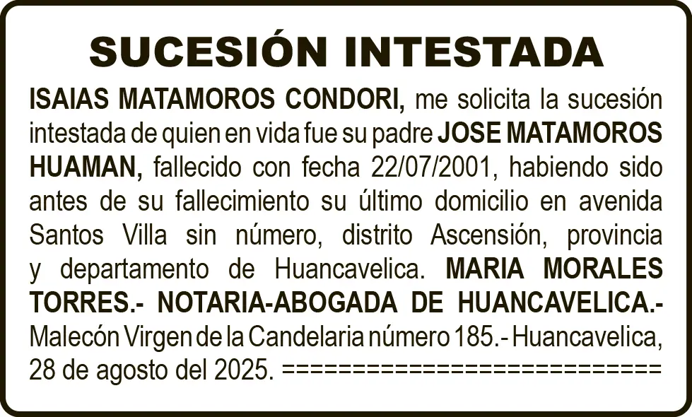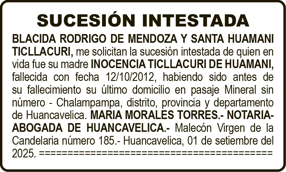 HUANCAVELICA SUCESIÓN INTESTADA SUCESIÓN INTESTADA – MARTES 02/SET/2025 martes, 2 de septiembre de 2025 | 1:42 AM SUCESIÓN INTESTADAMARIA MORALES TORRESNOTARIA – ABOGADA DE HUANCAVELICAPost navigationAnterior MARATÓN INTERNACIONAL: THALÍA VALDIVIA TRIUNFA EN “CIUDAD DE MÉXICO”Próximo RECTIFICACIÓN DE PARTIDA – MARTES 02/SET/2025