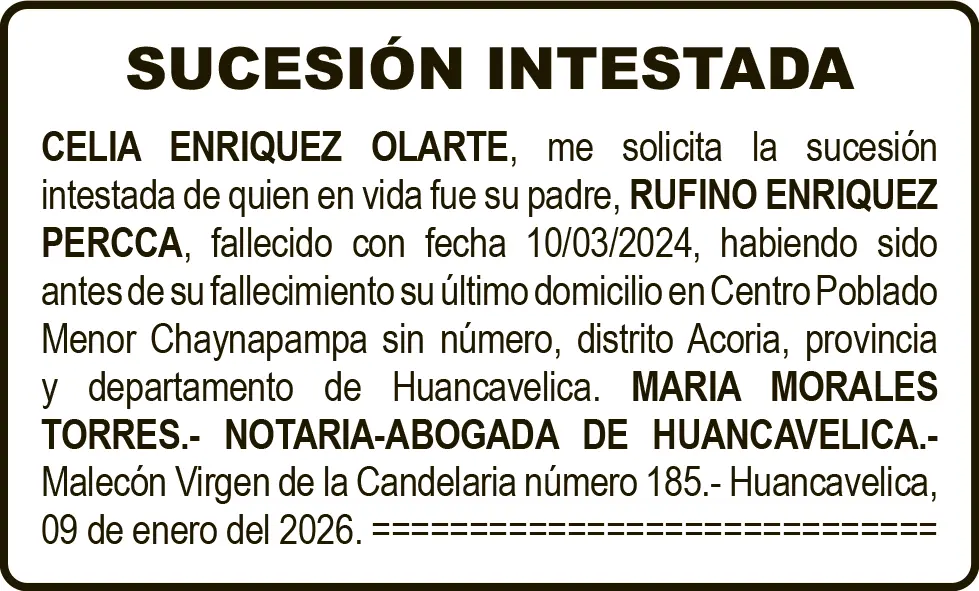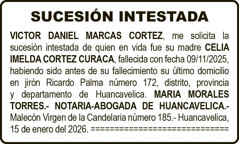 HUANCAVELICA SUCESIÓN INTESTADA SUCESIÓN INTESTADA – MIÉRCOLES 21/ENE/2026 miércoles, 21 de enero de 2026 | 6:27 AM SUCESIÓN INTESTADAMARIA MORALES TORRESNOTARIA – ABOGADA DE HUANCAVELICAPost navigationAnterior ANTE LA AGREMIACIÓN: SPORT HUANCAYO ALISTA ENCUENTRO AMISTOSOPróximo EDICTO MATRIMONIAL – MIÉRCOLES 21/ENE/2026