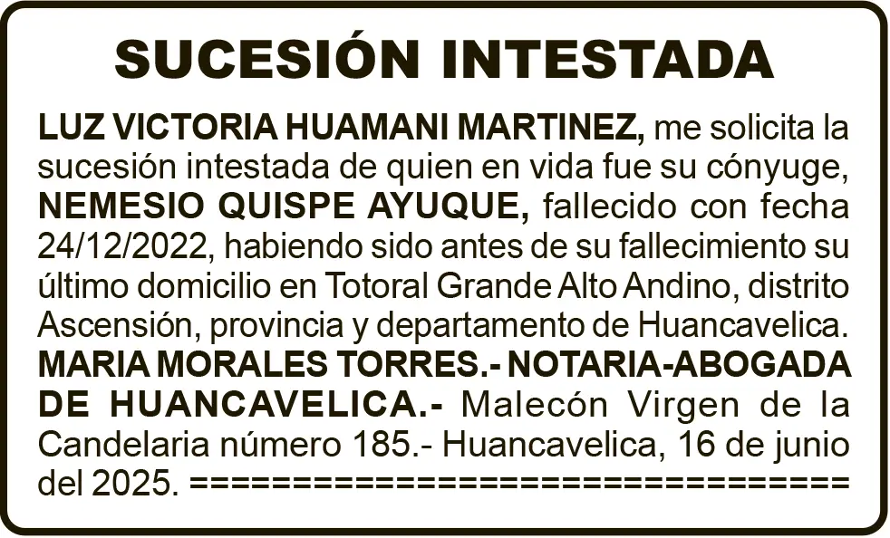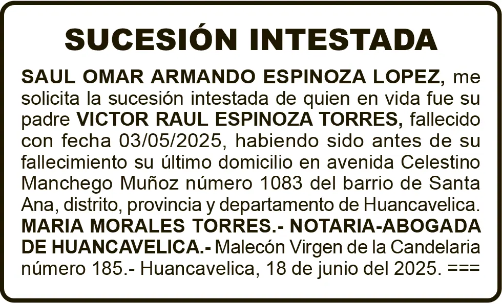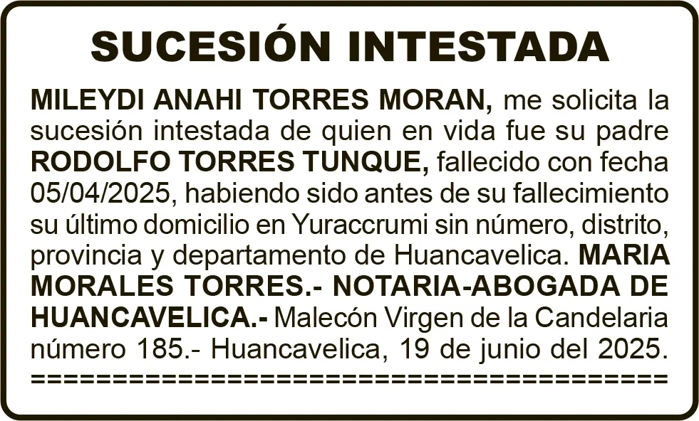 SUCESIÓN INTESTADA SUCESIÓN INTESTADA – VIERNES 20/JUN/2025 20 de junio de 2025 SUCESIÓN INTESTADAMARIA MORALES TORRESNOTARIA – ABOGADA DE HUANCAVELICAPost navigationAnterior PETITORIO MINERO PASCO – VIERNES 20/JUN/2025Próximo ADT RECUERDA SU XCVI ANIVERSARIO DE CREACIÓN