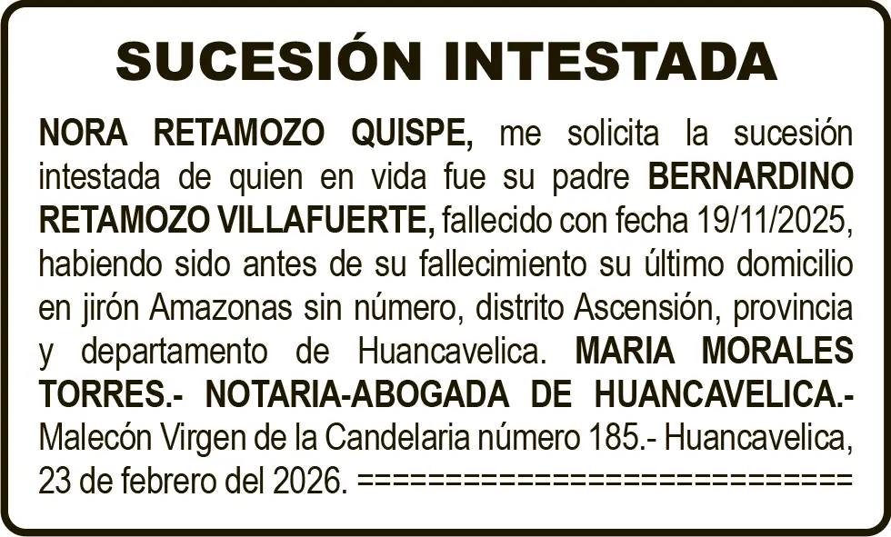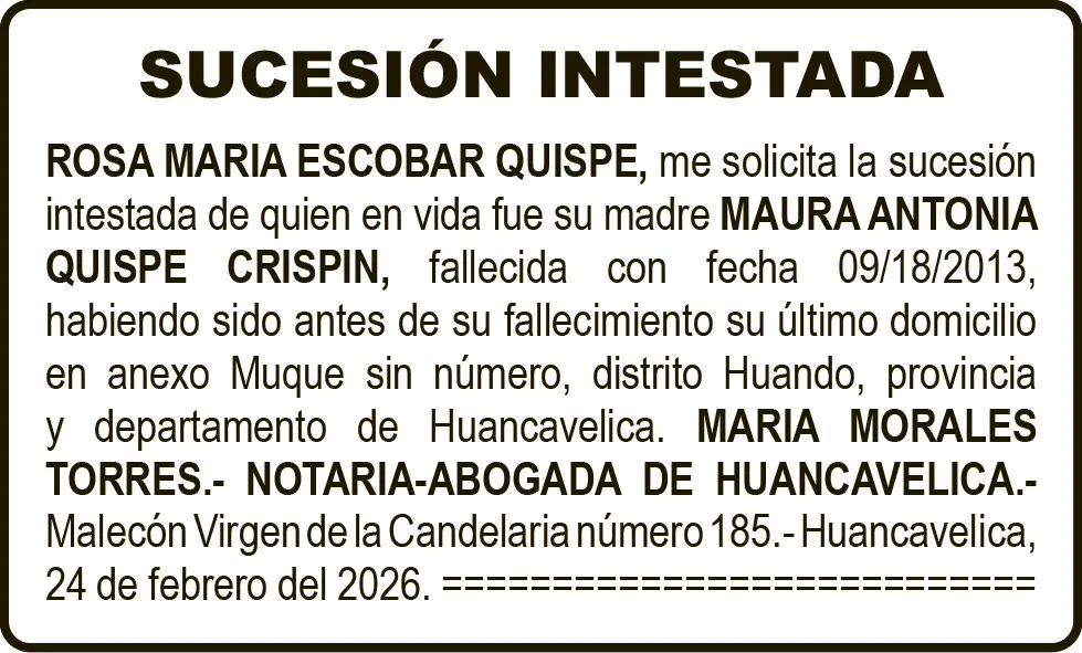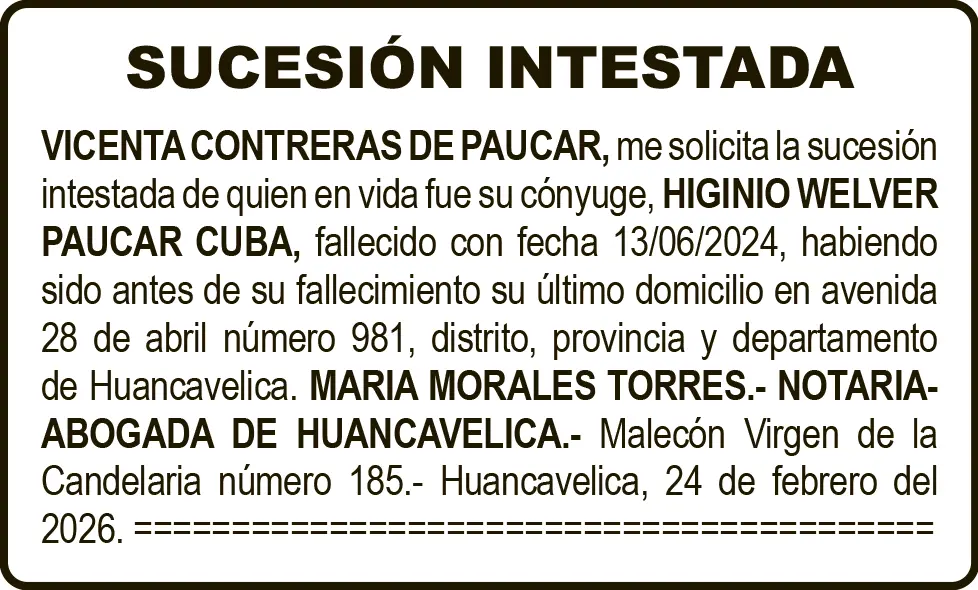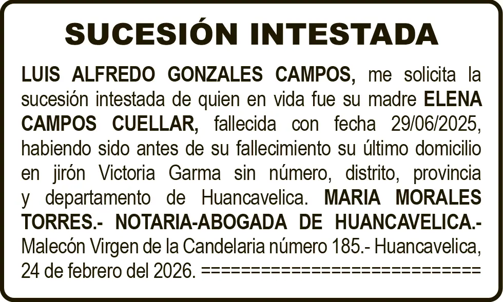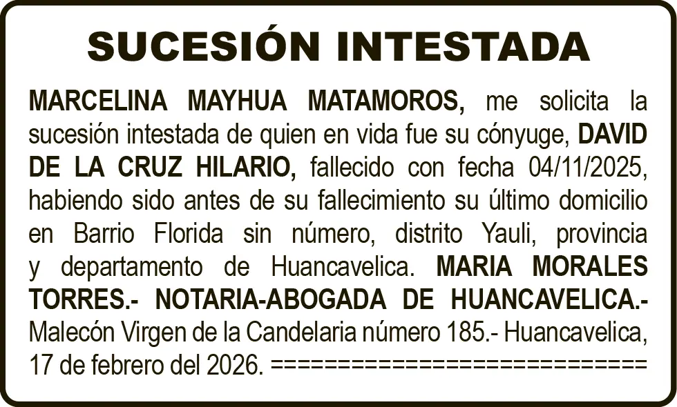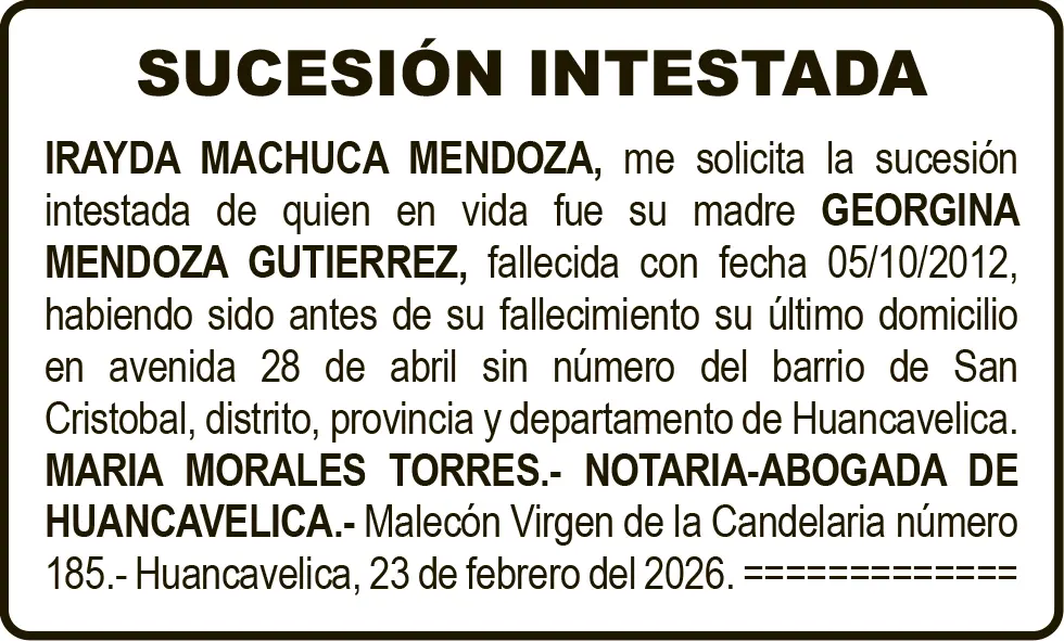 HUANCAVELICA SUCESIÓN INTESTADA SUCESIÓN INTESTADA – VIERNES 27/FEB/2026 viernes, 27 de febrero de 2026 | 6:52 AM SUCESIÓN INTESTADAMARIA MORALES TORRESNOTARIA – ABOGADA DE HUANCAVELICANavegación de entradasAnterior CONVOCATORIAS – VIERNES 27/FEB/2025Siguiente SAN RAFAEL: CON DRON BUSCAN A NIÑA DESAPARECIDA HACE 11 DÍAS