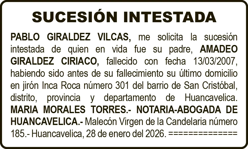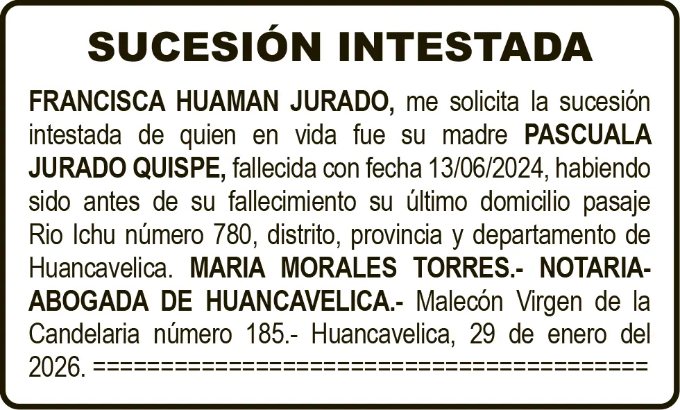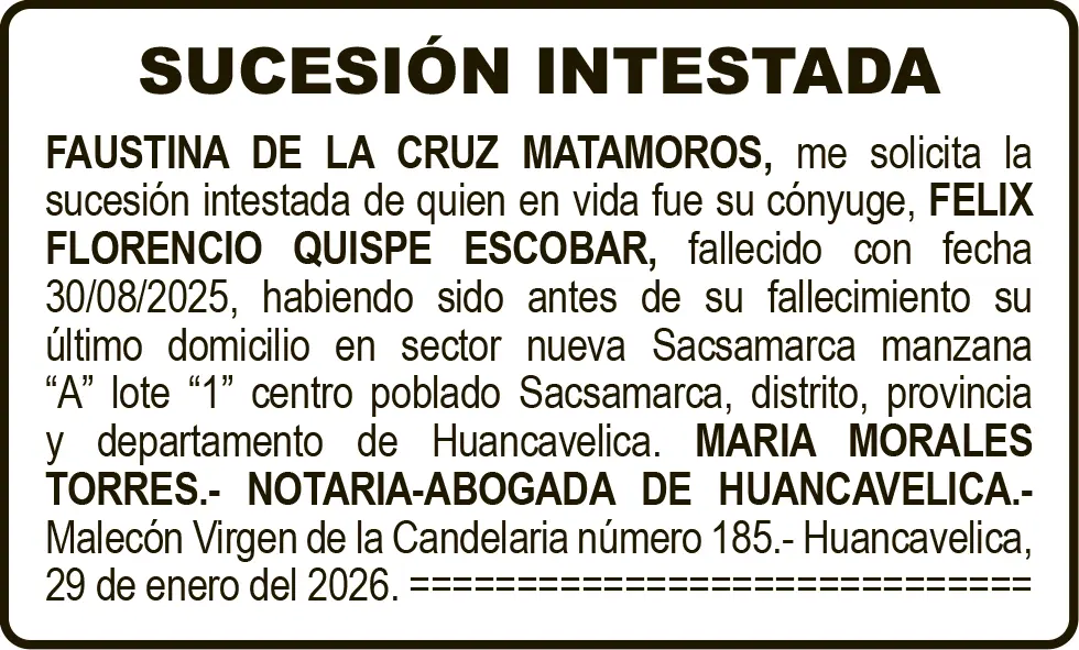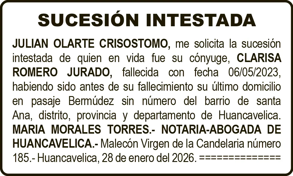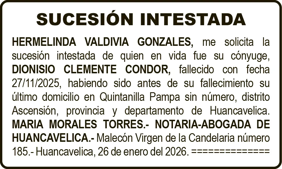 HUANCAVELICA SUCESIÓN INTESTADA SUCESIÓN INTESTADA – VIERNES 30/ENE/2026 viernes, 30 de enero de 2026 | 6:05 AM SUCESIÓN INTESTADAMARIA MORALES TORRESNOTARIA – ABOGADA DE HUANCAVELICAPost navigationAnterior 15 PARTIDOS POLÍTICOS DE PASCO SUSCRIBIERON PACTO ÉTICO ELECTORALPróximo ELECTROCENTRO RECOMIENDA REALIZAR JUEGOS DE CARNAVAL LEJOS DE LAS REDES ELÉCTRICAS