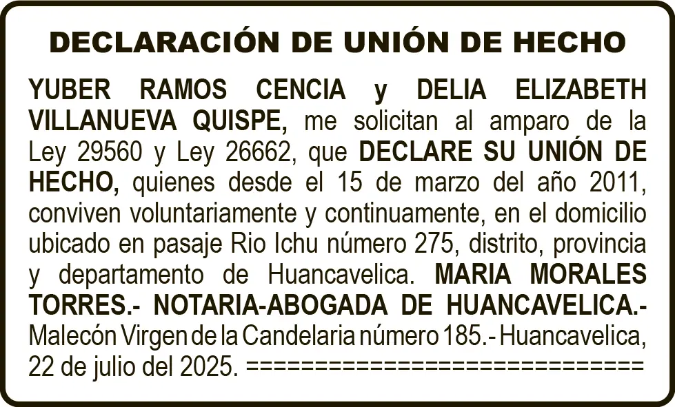 HUANCAVELICA UNIÓN DE HECHO UNIÓN DE HECHO – LUNES 11/AGO/2025 11 de agosto de 2025 UNIÓN DE HECHOYUBER RAMOS CENCIA Y DELIA ELIZABETH VILLANUEVA QUISPENOTARIA – ABOGADA DE HUANCAVELICAMARIA MORALES TORRESPost navigationAnterior CHURCAMPA: LLORA A KEVIN QUE MURIÓ EN TRÁGICA CAÍDA EN AYACUCHOPróximo NOTIFICACIÓN DE PRETENSIÓN – LUNES 11/AGO/2025