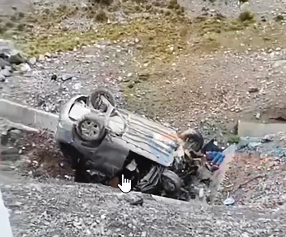 Como consecuencia del violento impacto, la camioneta se despistó y cayó varios metros fuera de la vía, quedando completamente volcada, situación que provocó que sus ocupantes quedaran atrapados en el interior de la unidad.
